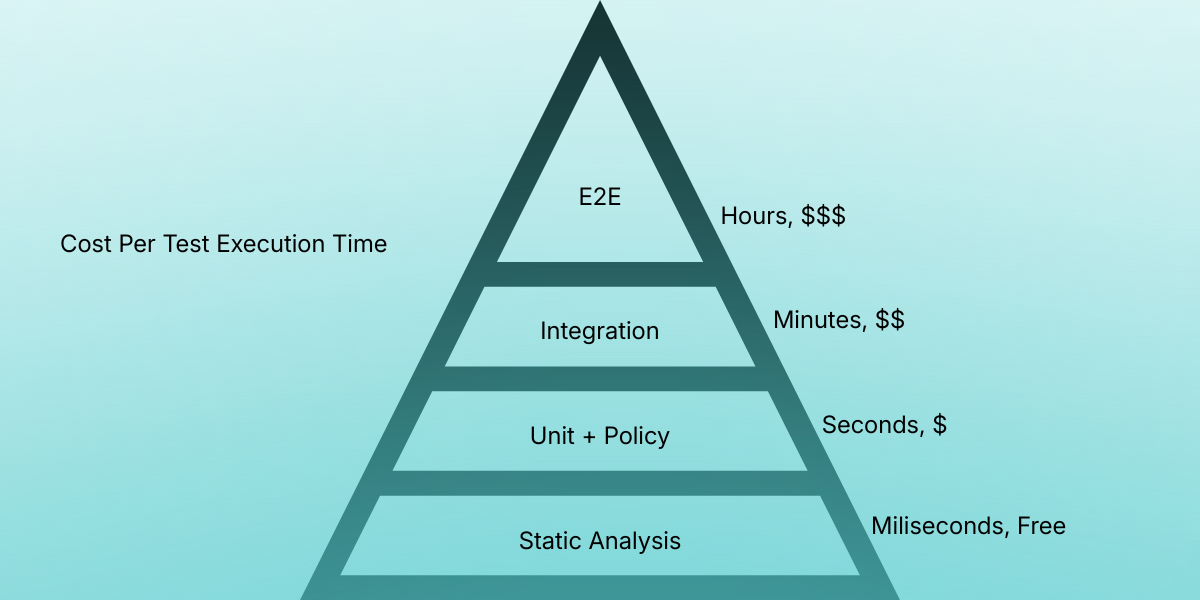 The testing pyramid originated in the early 2000s from agile and Extreme Programming practices and was popularized by Mike Cohn as a way to guide teams toward fast, reliable feedback. It describes a layered approach where most tests live at the lowest levels—static analysis, unit, and policy checks—because they are cheap and quick, while progressively fewer tests exist at higher levels like integration and end-to-end testing due to their cost and execution time. In infrastructure testing strategies, the pyramid reinforces the idea of catching failures as early as possible, minimizing slow and expensive E2E runs while still maintaining confidence through targeted integration and system-level tests.